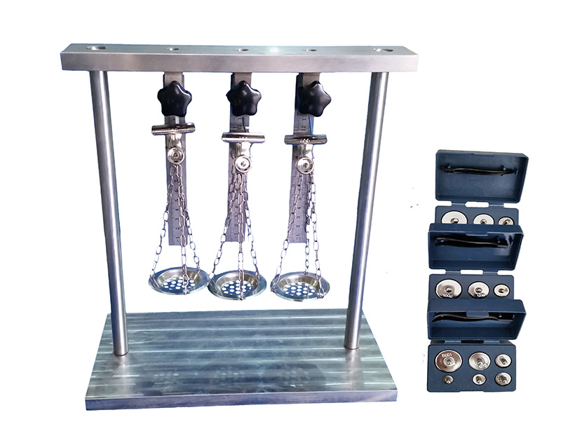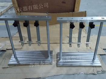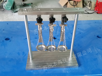 本裝置配合高溫烘箱使用,試樣懸掛在裝置上并置于烘箱中,下夾頭加重物,在10分鐘后,測量標(biāo)記間的距離并計算伸長率。